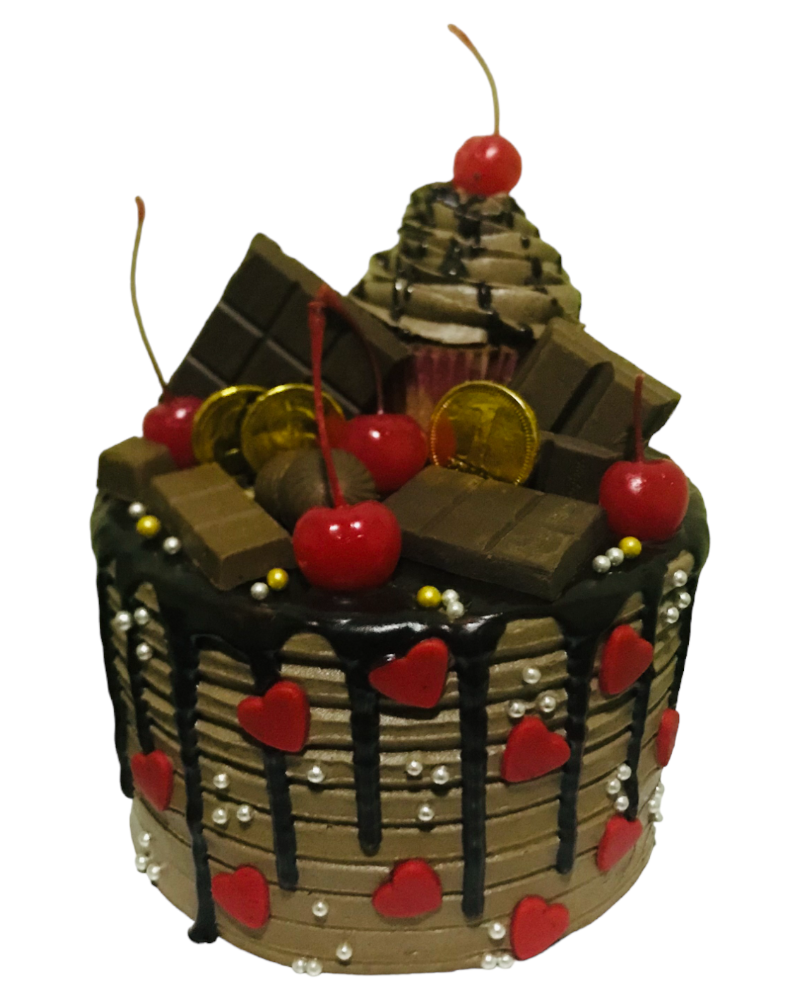 Indulge in pure decadence with this rich chocolate cake, layered with creamy frosting and topped with KitKat bars, cherries, and gold coins. Finished with a luscious dark chocolate drip and decorated with red hearts and pearls — it’s the perfect centerpiece for any celebration of love and luxury!